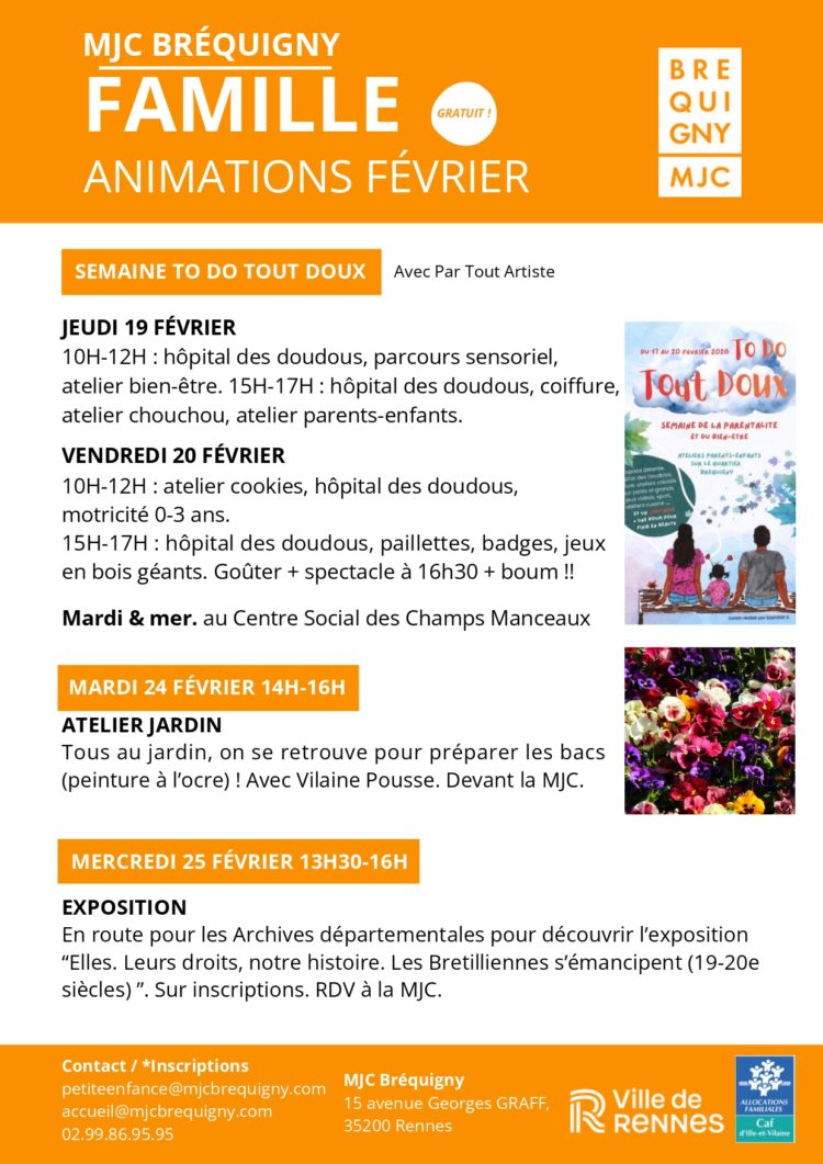 57 kb Actualités Programme famille février Allez hop ! Un mois de février en famille à la MJC ! Allez hop ! Un mois de février en famille à la MJC ! To Do Tout Doux, jardinage, de quoi vous amuser et découvrir plein de choses avec vos petit·es ! Téléchargez le programme ici. 135 kb 03Fév2026 Partager cet article :